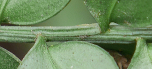 The shrub has green, erect and striated stems (i.e.the stems have lines or small ridges running along them - see adjacent image). The stems send out short branches, which bear many pointed ‘leaves’. These ‘leaves’ are actually flat (modified) shoots, known as cladodes. They have the appearance of stiff, spine-tipped leaves. Each cladode / ‘leaf’ ends in a single sharp spine.