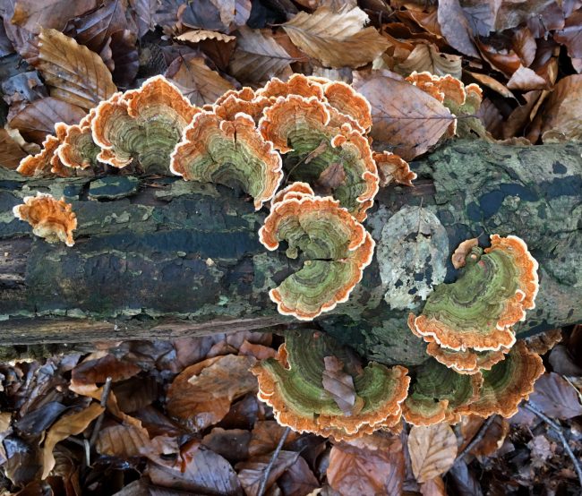 While the winter woodlands are now largely bereft of the colourful cornucopia of mushrooms we’ve been seeing over the past few months, bracket fungi abound. It only seems fitting, then, to add a seasonal twist to this month’s fungi focus and take a look at one of our most commonplace and picturesque examples, the Turkey Tail (or Turkeytail), as well as one of its closest lookalikes.   Turkey Tails are very much a fixture of woodlands across Britain, and indeed are widespread throughout much of the world. This catchy common name, which succinctly describes the colours and forms of its variegated fan-shaped shelves, seems to have crept over from America fairly recently. Previously it was known over here by the rather more prosaic yet equally descriptive name of the Many-Zoned Polypore, a fair rendition of its Latin binomial Trametes versicolor.