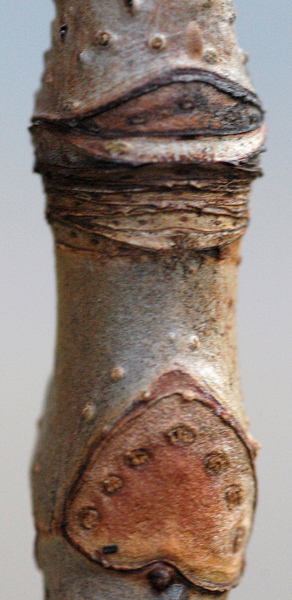 The winter buds are arranged along the twigs in pairs and each pair is set at 90° to the previous pair. The twigs often have many leaf scars, which are described as horse shoe shaped - even down to the ‘nail holes’ . The ‘nail holes’ represent where the fibrous xylem (water conducting) tissue entered the leaf. The buds are quite large, and are protected by scale leaves, these have a deep red-brown colour and are sticky. The scale leaves are significant structures and when they fall away, they leave significant scars. It is possible to determine annual growth by looking at the position of these scars along a stem. Raised lenticels (gas exchange pores) can be seem on the stems.