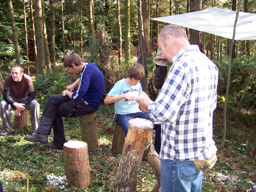The prompt arrival of the stag party group brought another surprise - a woman in their midst! She was to be an honorary man for the weekend, I was informed. A short walk led through the wood, to our prepared camp with a small fire and a brew on the go. After introductions and much banter at the stag’s expense, the spoon making began.