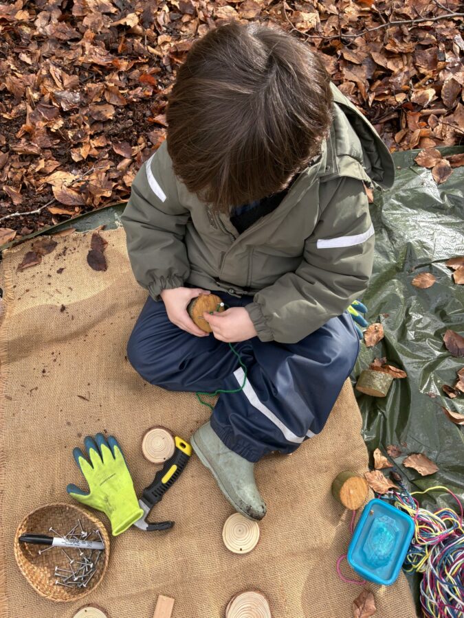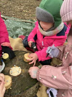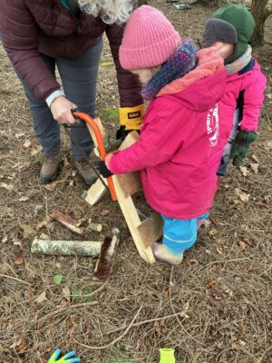 In Robin wood, the children are learning all the time, from tree identification, they understand what a beech husk is and search for beechnuts, they know acorns grow into oak trees and regularly use the word nocturnal when talking about night animals. Other skills normally not associated with preschool children include, whittling wood, sawing logs using hacksaws and bowsaws, they hammer nails into their sawn offcuts and use flints and steels to start fires, cooking lunch from scratch.