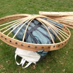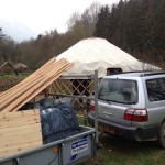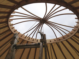 Once the lattice walls are erected around a very strong doorway the roof ribs are put in, one by one. A strong band stops the yurt frame falling outwards and the crown is then lifted on and fixed in place. The whole yurt frame is then covered with a fabric and this creates a structure that is weatherproof and remarkably portable. Henry reckons he can erect a yurt in under 2 hours. And considering the work that goes into them they don't seem expensive at £3,200 for the 12ft diameter one shown here, going up to £12,000 for the much larger 30ft yurt.