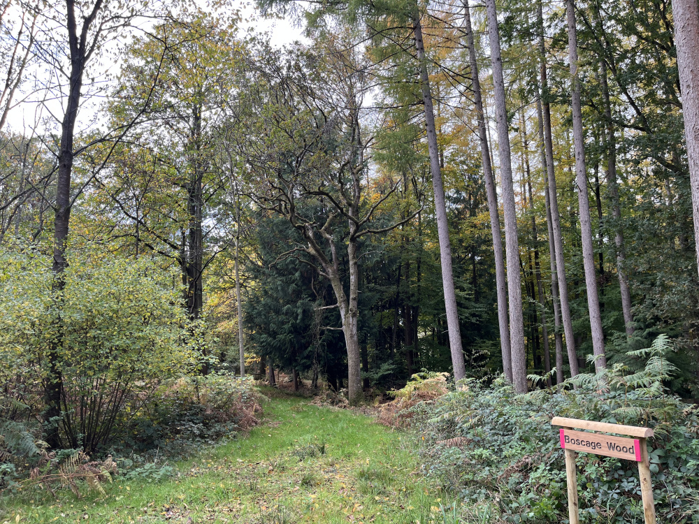 A well constructed woodland track leads to the entrance to Boscage Wood from where a series of pathways through the wood provide access deep into the cover of mature woodland. At every turn the differing character and tree variety within this woodland awaits discovery. The keen eyed will pick up the ancient trails leading through the forest where the thick cover of cherry, larch and cedar gives way to an impressive parkland style vista of established oak.