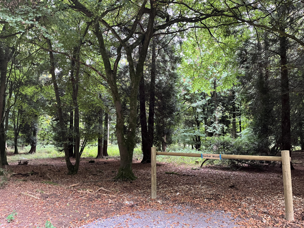 From the gate proceed straight ahead along the woodland track for 600 metres until it bears sharply to the left. After a further 220 metres you will see the blue boundary markings and wood name sign at the entrance to Dunbar Wood on your right.