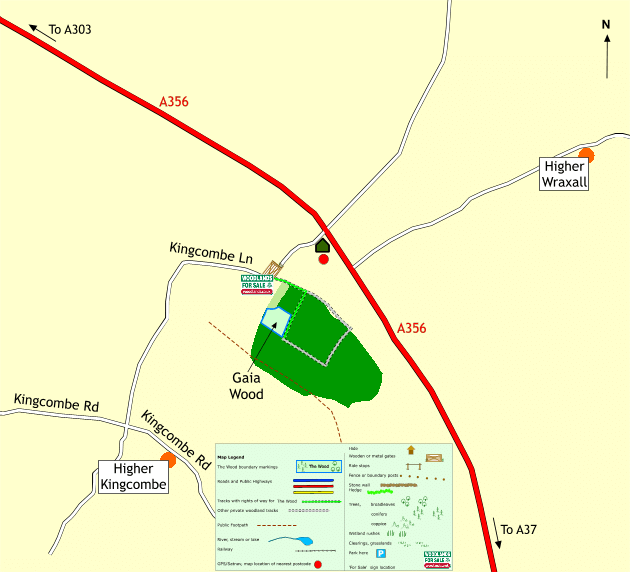 From a car parking area near this entrance you can proceed on foot straight up the woodland track beyond the locked access gate then turn right after 150 metres and follow the track for a further 120 metres. At this point you will see the blue markings and name sign for Gaia Wood on your right.