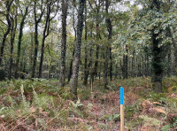 Boundaries are indicated by blue coloured markings on posts and trees running through the wood to the north and north west. At the far west boundary there are open fields and the access track forms the boundary to the east. To the south is a private woodland track serving a neighbouring woodland.