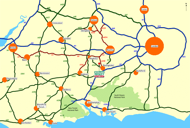 From the A339 between Newbury and Basingstoke take the first turning north to the village of Ramsdell and then left from the crossroads at the village centre onto the Baughurst Road for 400 metres until a right hand turn to West Heath. After another kilometre and a half there is a sharp right turn onto Church Road past some farm buildings. Then, after 500 metres you will see the first of two 'woodlands for sale' signboards on your left. After the second signboard there is a locked entrance gate into the woodland.