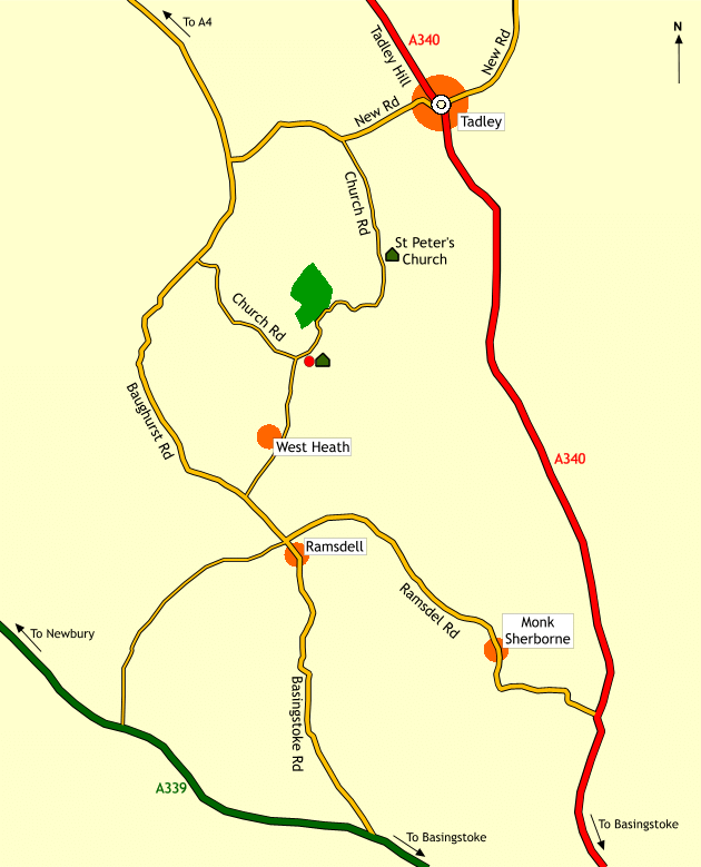 From Tadley, leave the A340 (Tadley Hill) at the roundabout and turn west along New Road for approx 800 metres until a left turn onto Church Road. After about a kilometre you will pass St Peters Church on your left and after a further 800 metres you will reach the signboard and entrance gate to the woodlands on your right. From here follow the instructions as below.