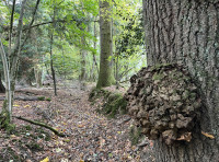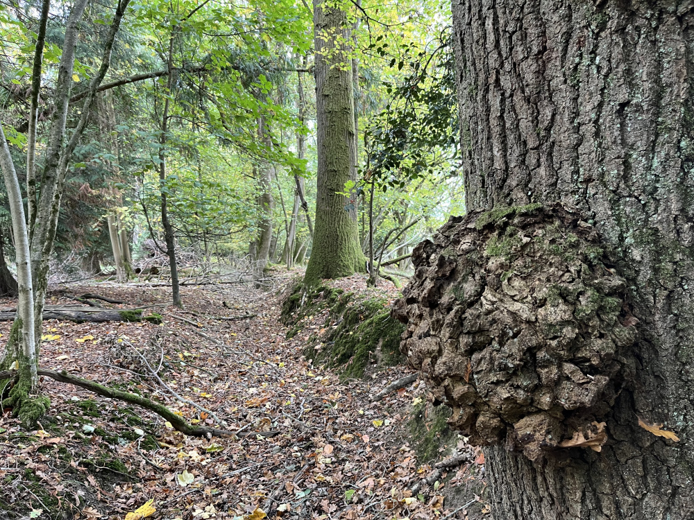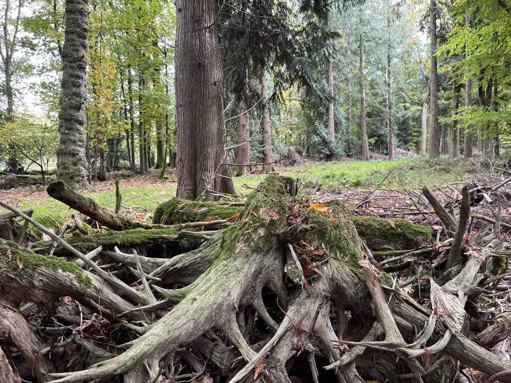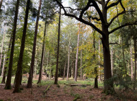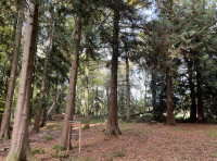 Giant oak marks the eastern boundary and equally impressive examples dominate open clearings at the woods centre. Look out for the highly prized oak burrs that adorn these trees. Although a sign of historic injury or stress this highly grained timber is much prized by joiners and wood turners for its decorative quality. Elsewhere within the wood, beech and western red cedar stand amongst Corsican pine and provide an ever changing character of light and colour as the seasons change.
