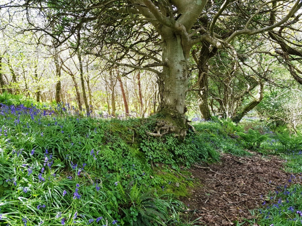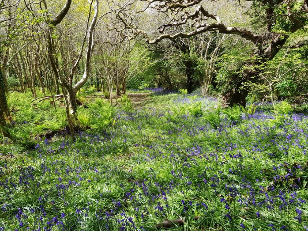 An open mixed broadleaved woodland with bluebells set in a peaceful part of west Cornwall close to the coast.