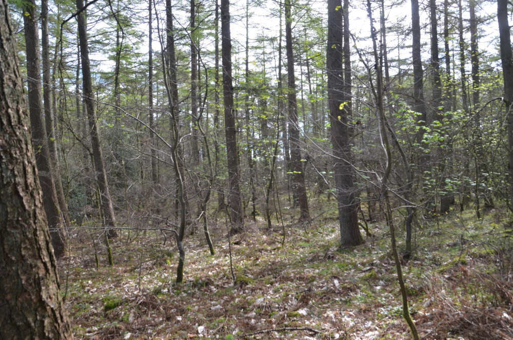 The larch is in an ideal state for selective thinning of the mature conifers to be undertaken. This would allow the native deciduous trees to assert themselves and take over the space created. A very useful supply of domestic firewood could be sourced from this sympathetic process, as well as contributing to the management of the woodland to encourage and increase bio-diversity.