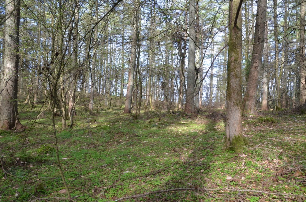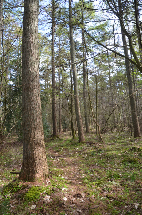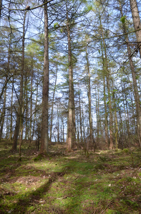 The main species within the wood is well spaced european larch. Between, a large variety of native broadleafs have self-seeded and flourished: Elm, birch, beech, and sweet chestnut are well scattered throughout the wood with some much larger oak, beech and sycamore along the northern boundary.