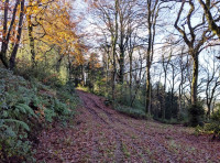 - At the first fork take the left hand track that heads up hill to the top of the woodland and stay on this track for around 800 metres until you come to another fork in the track just past a bench.