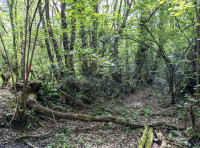 An understorey of hazel coppice points to a traditional 'coppice with standards' historical management system. This is where well spaced 'standard' trees, often oak, are under planted with hazel. The hazel can be coppiced every few years to give straight poles for produce hurdles, bean poles and hedging stakes along with firewood or material for charcoal making while the standard trees grow to maturity for use as timber for construction.
