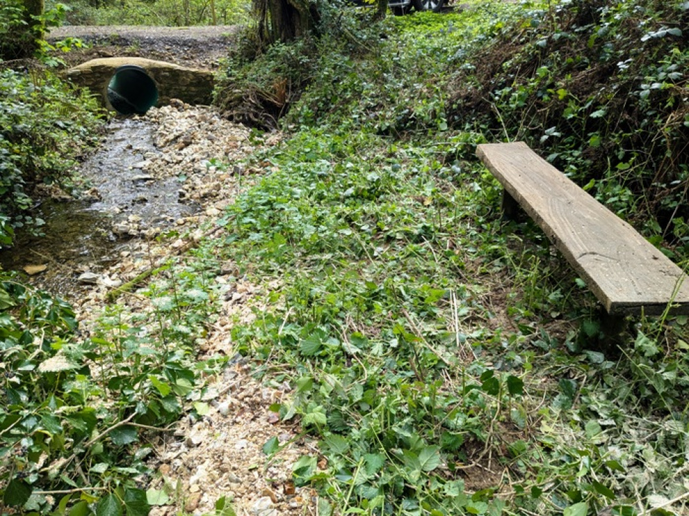Just off the access track at the bottom of the valley is a small communal area of woodland with stream frontage and a bench in a quiet spot where you can enjoy the relaxing sound of flowing water. This waterfront area is restricted to the exclusive use of a small number of private woodland owners.
