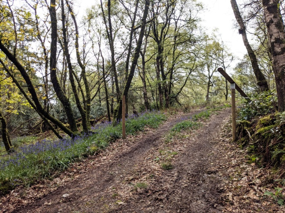 - Head under the ride stop and walk down the forestry track until you come to a right-hand turn; take this turn along a beech tree–lined section of the track.