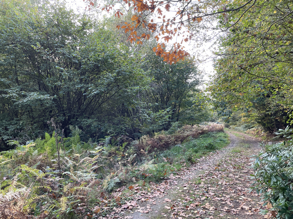 Good hazel coppice stools are found along with tall poplars. The understorey of laurel, holly and rhododendron provide all year cover and privacy. In the southern section of the woodland a number of mature pines tower over the other trees. A stand of sweet chestnut provides plenty of food to roast over a winters fire.