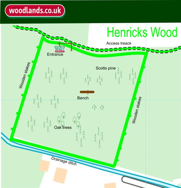 The indicative boundary markers of Henricks Wood are as follows, North boundary is the edge of access track, South boundary is a drainage ditch just on the outside of a fence. East & West are indicated by a row of painted wooden stakes.