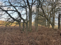 The east boundary is lined with mature oak trees and the south east corner too. The southern half has bracken covering while the northern half has a large area of grass with some gorse.