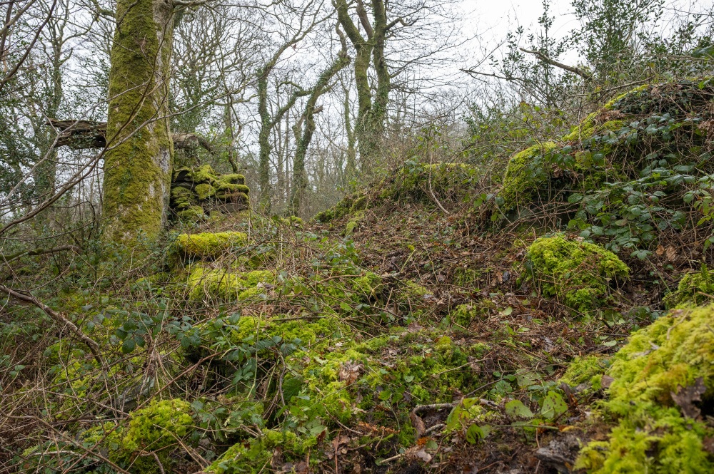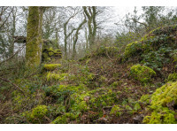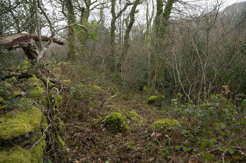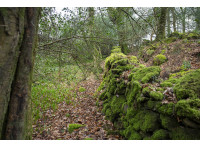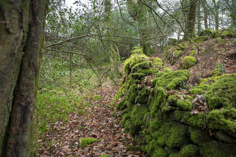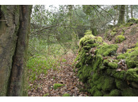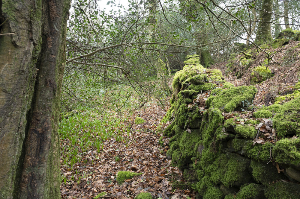Off the vehicular track there is a short brush-cut pathway to lead you into the lower woodland. Here you'll find some of the ancient walls.