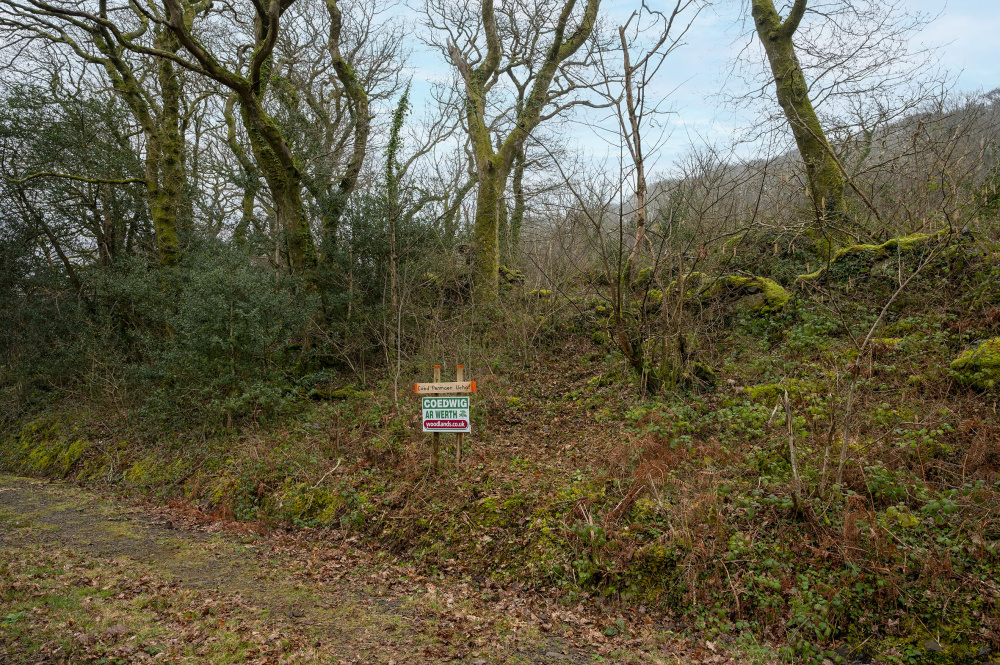 After about 400m the track turns a hard left between two wooden posts. Follow this track nearly to a turning circle. The entrance to Coed Penmaen Uchaf is half way to this turning circle on your right.