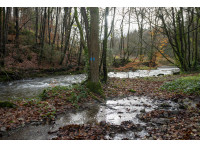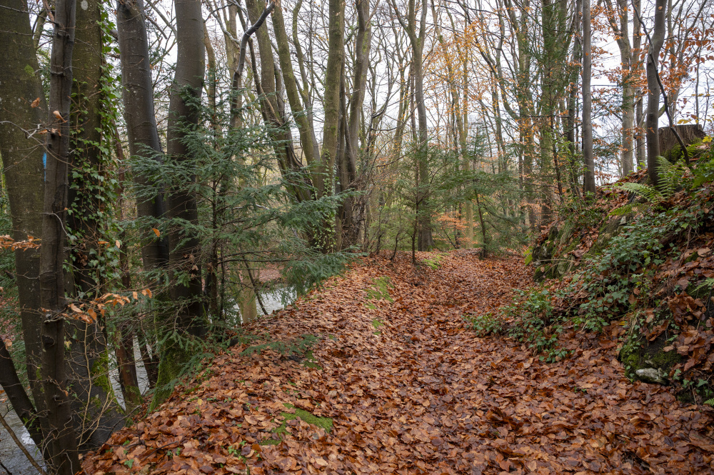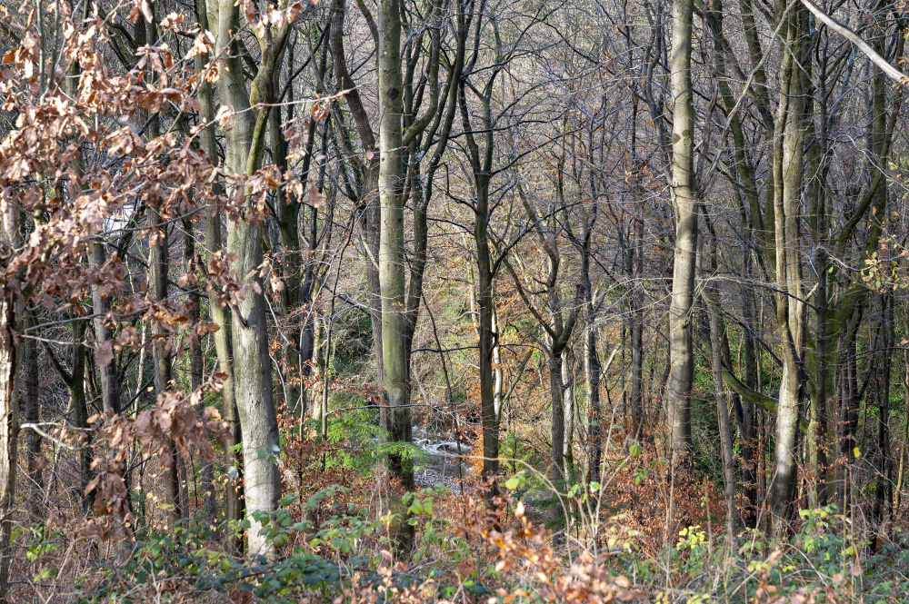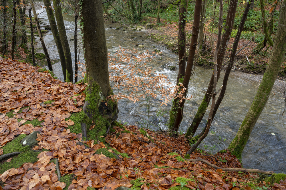 At the lower end of the woodland runs the Afon Alyn river. The river itself runs dry most of the year. This link will show you when it is running https://www.gaugemap.co.uk/#!Detail/960/978/2025-10-27/2025-11-27. There is excellent access to the river banks throughout the woodland via large flat 'beaches'.