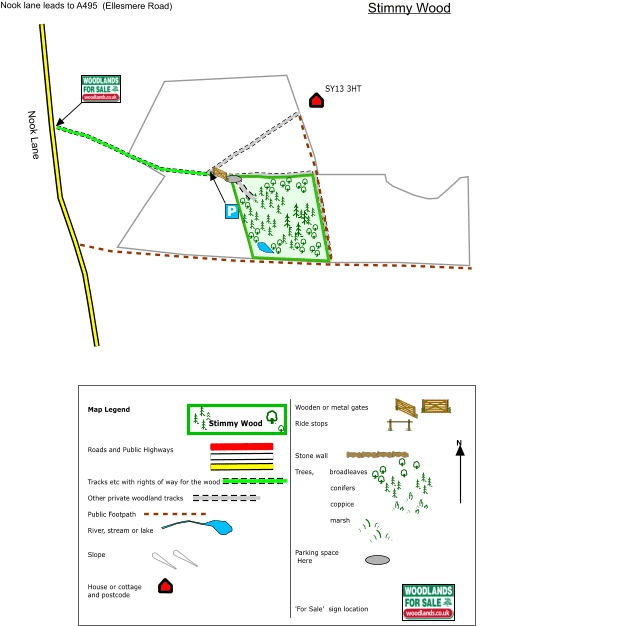 Take the A525 to Redbrook, then the A495 to Bronington. Pass through the village, after 1.6 km / 1 mile take the gravel road signed as Nook Lane on your left. Follow this gravel lane for 0.7 kms or 0.5 miles and then turn left into Bronington Wood