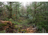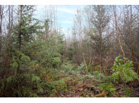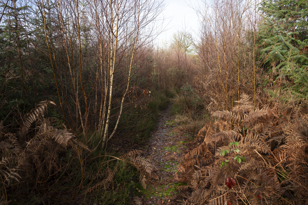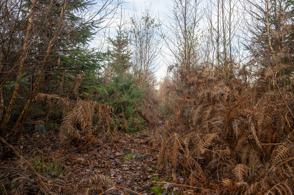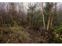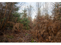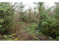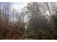 From the parking area, a brush cut pathway leads into the woodland, where a small clearing can be found. There is potential to create a network of paths through the woodland to further manage or enjoy the woodland.