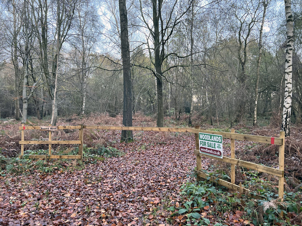 The entrance to Bosard Wood is here on the right, clearly marked with the name and a for-sale sign.