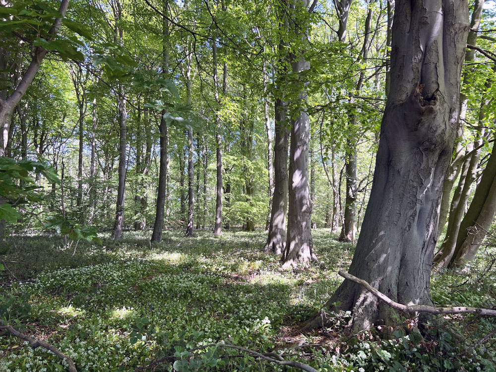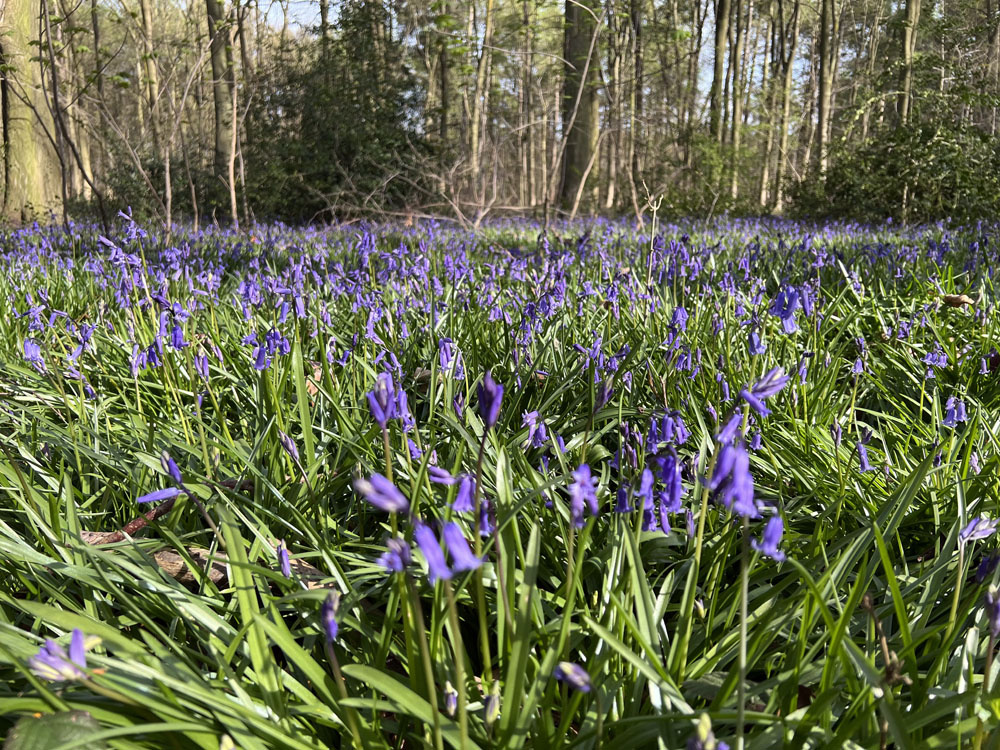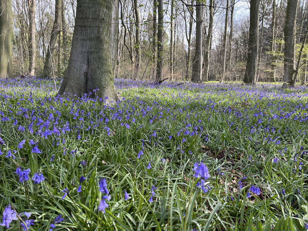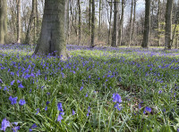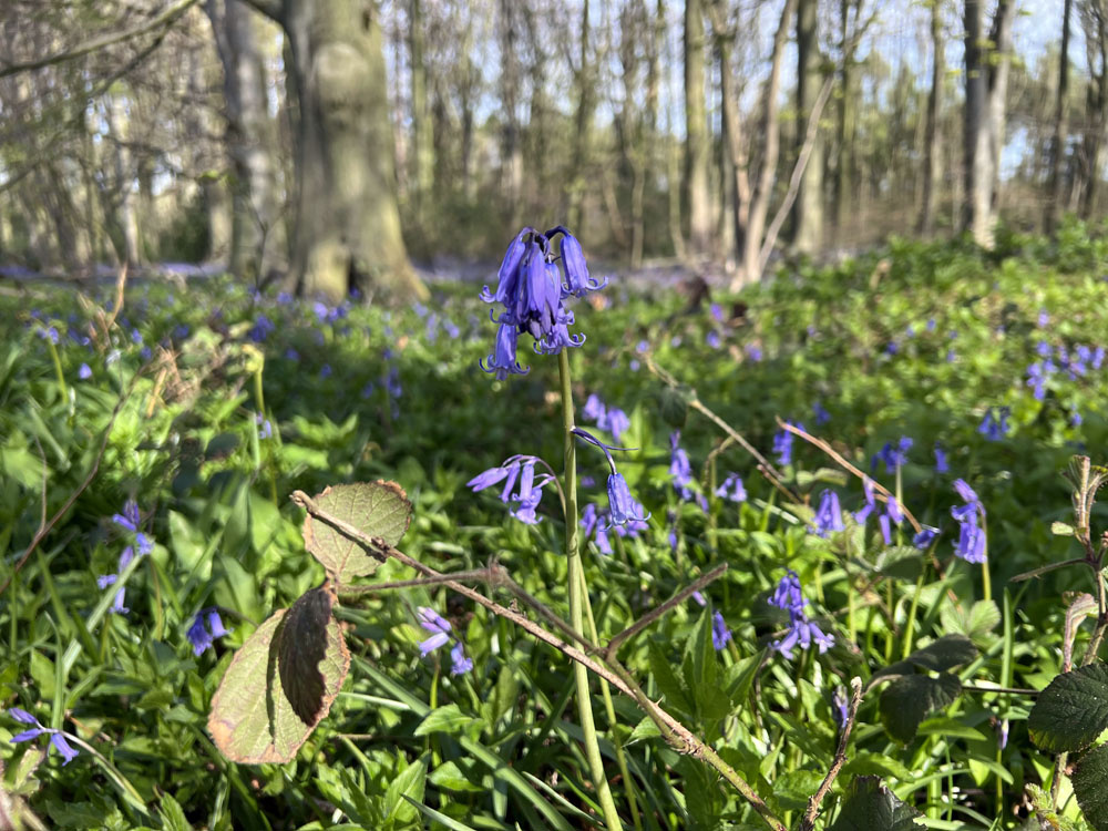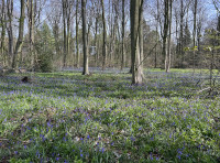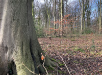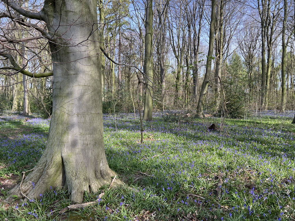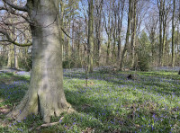 From the ride-stop entrance, a path leads off directly through the trees. Roughly halfway into the wood, the type of trees change to mixed broadleaves with oak, sycamore and ash, giving way to a large area of mature beech trees. The ground flora changes too, and there are masses of bluebells and dog’s mercury growing beneath the deciduous trees.