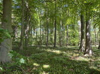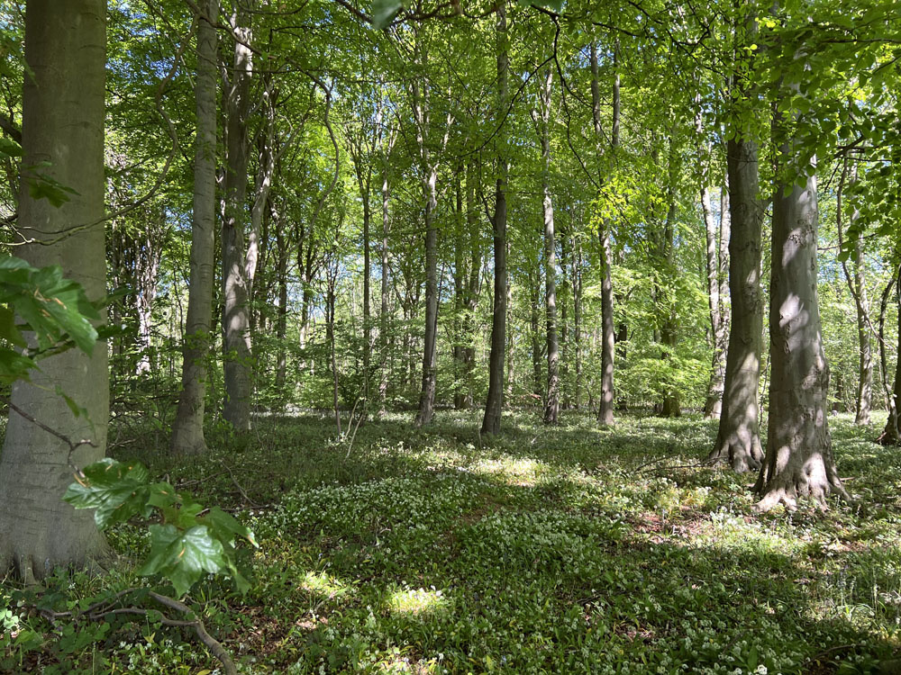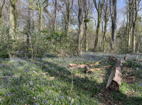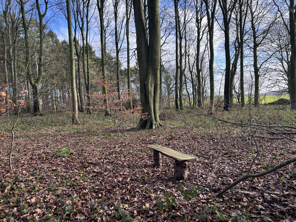 A rustic bench has been set in a scenic spot beneath the beeches, not far from the southern boundary. The bluebells are particularly abundant in the area, making quite a show in the spring, there are also significant swathes of wild garlic near the southern boundary.