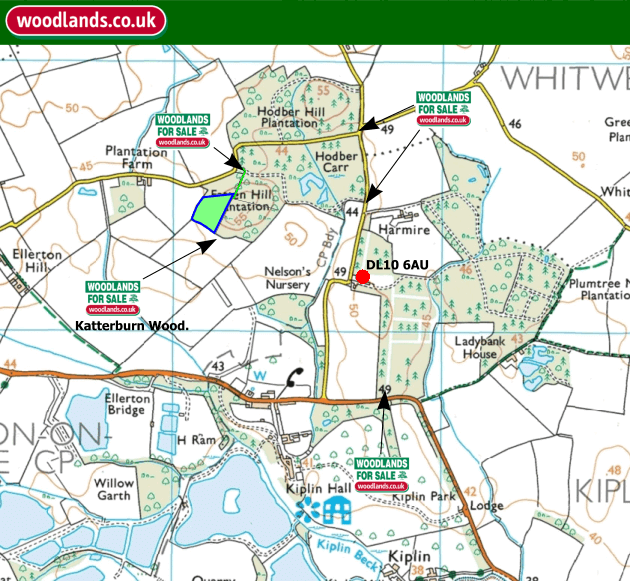 Satnav: the postcode DL10 6AN covers several properties and the wood. The point shown by the red dot on the location map/s is the wood entrance gate.