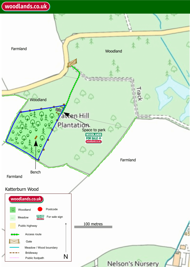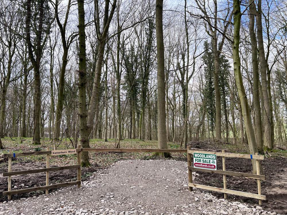 After a sharp left hand bend you will see a gateway with a ‘Woodland for sale’ sign on your left.