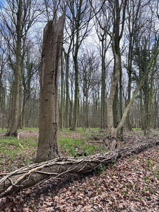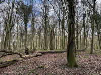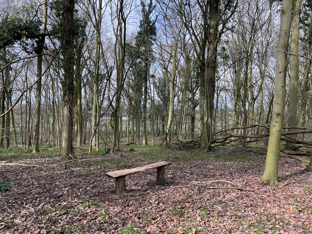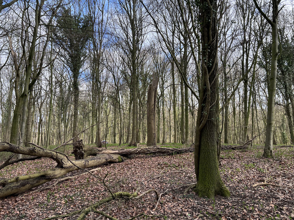 From the ridestop entrance, which is set on the plateau of a small hill, known locally as ‘Fatten Hill’, if you strike off south westwards, following the contour, you reach a dell enclosed by a couple of old fallen tree trunks and a striking standing dead ash trunk (an ideal bat roost?). In this space, a rustic bench is situated. This spot might make a good base camp, with the land then dropping gently away to the south and west boundaries that border farmland.