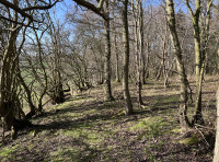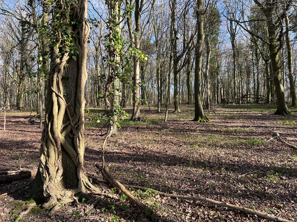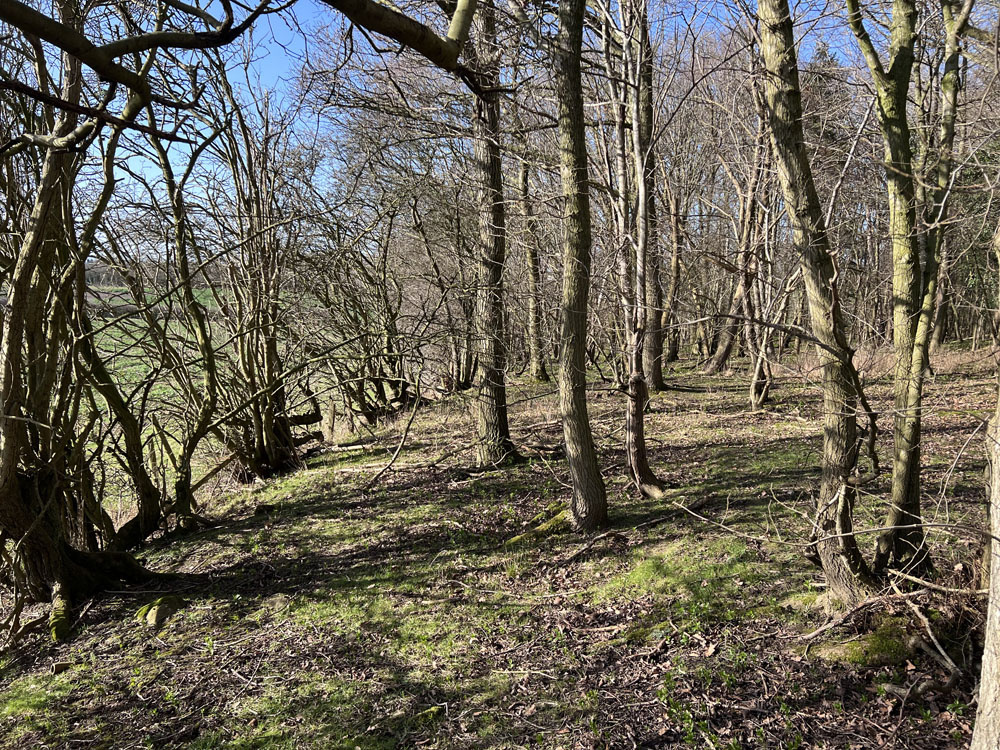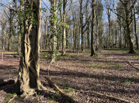 Along the edges of the wood, there are remnants of old hedgerows with views across the countryside and a number of large, ivy-clad oak trees on the slope.