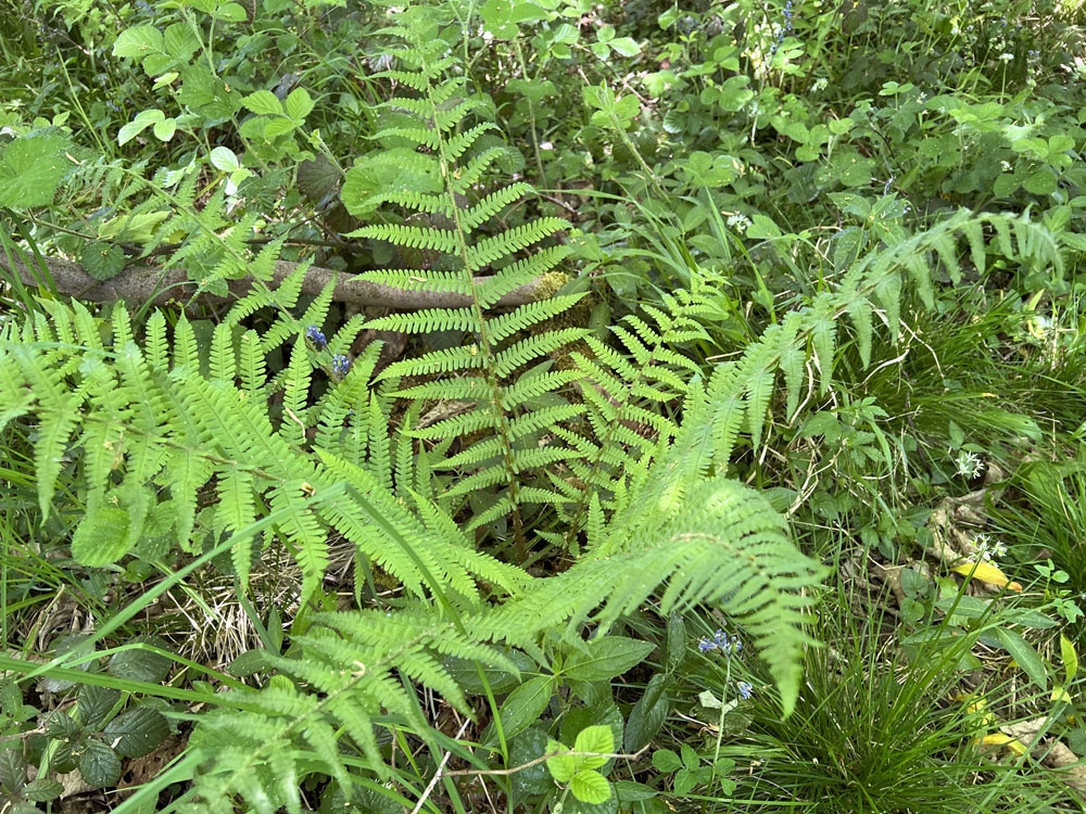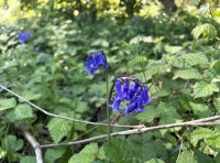 A path leads into the wood, close to the bench, with a circular route that passes coppiced hazel, an impressive sweet-chestnut tree, holly, sycamore, oak, and ash, whilst at ground level there are some beautiful woodland grasses, a carpet of bluebells, dogs' mercury, wild garlic, native ferns, wood anemone, violets and fruiting plants such as wild strawberries, wild raspberry and blackberry.