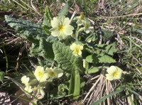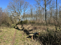 Up on the limestone ridge that sits above the Wharfe valley, Moon Copse slopes very gently to the north. Good stone tracks lead to the ride-stop entrance at the north-western corner of the wood, a wide grassy track runs the length of the western edge of the wood, bordered by an old hedgerow with farmland beyond. A ditch (the centre of which is presumed to be the true boundary line) is flanked by characterful coppiced hedgerow trees such as hawthorn, hazel and ash. A larger oak tree can also be found along this edge with a rustic bench at its foot.