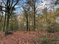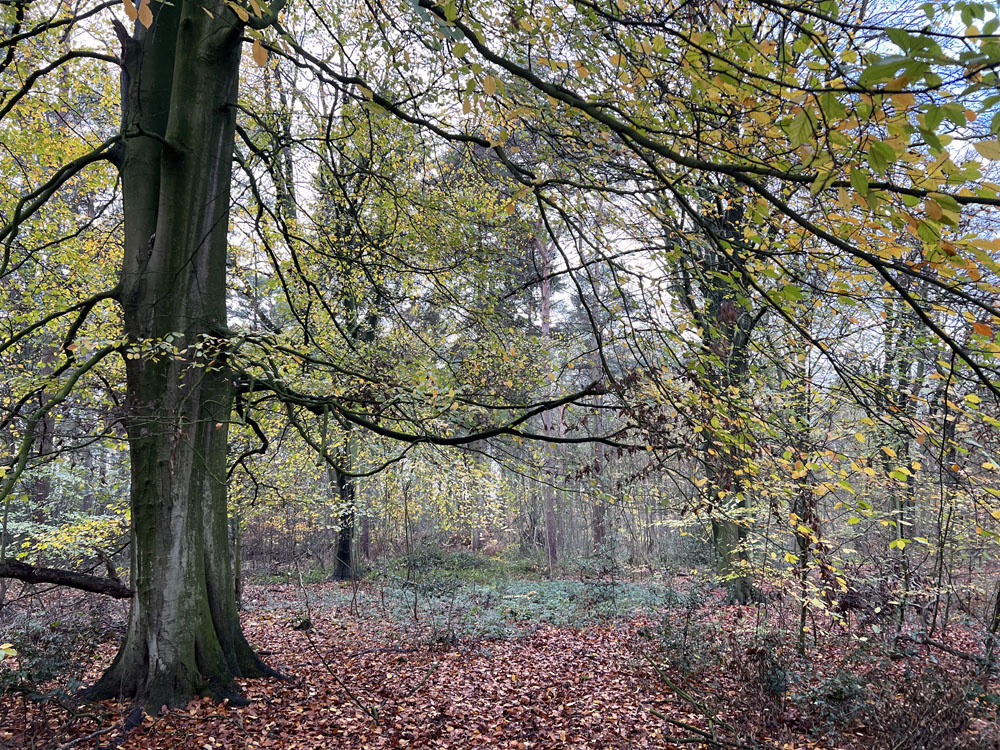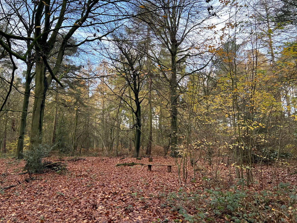 From the ride-stop entrance, a path leads off to the right, initially parallel with the main track. It then turns south beneath a rowan tree and weaves through the trees to emerge where there are some large beech trees, towards the western boundary. Here a bench is situated surrounded by a grove of beech where the forest floor is quite open.