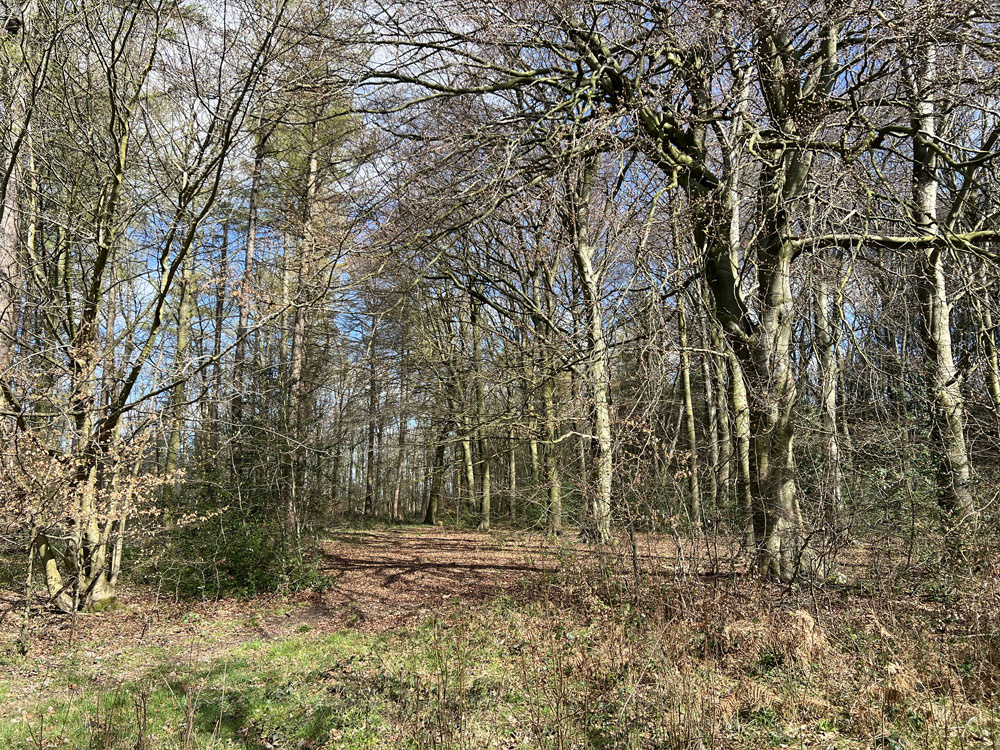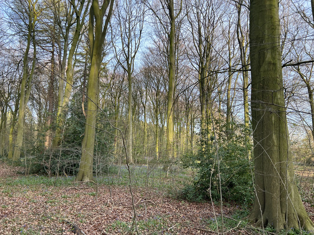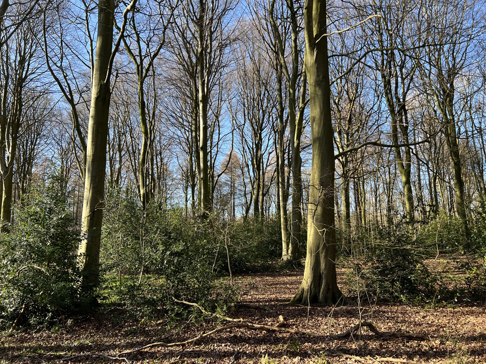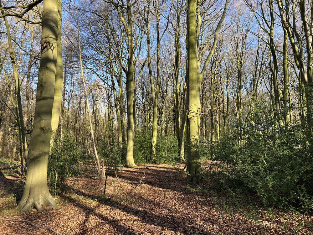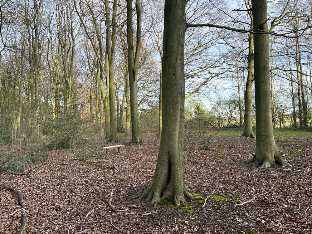 Closest to the ride-stop, there is a mix of sycamore, larch and a few ash but these quickly give way to a large grove of lovely beeches, with holly bushes that give a great deal of privacy and create little enclosures. One such glade has a rustic bench situated to enjoy the surroundings.