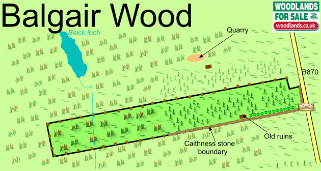 Boundaries are marked by a combination of original Caithness stone fencing, stock net and individual posts marking the boundary between woods.