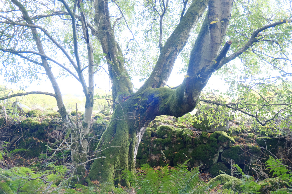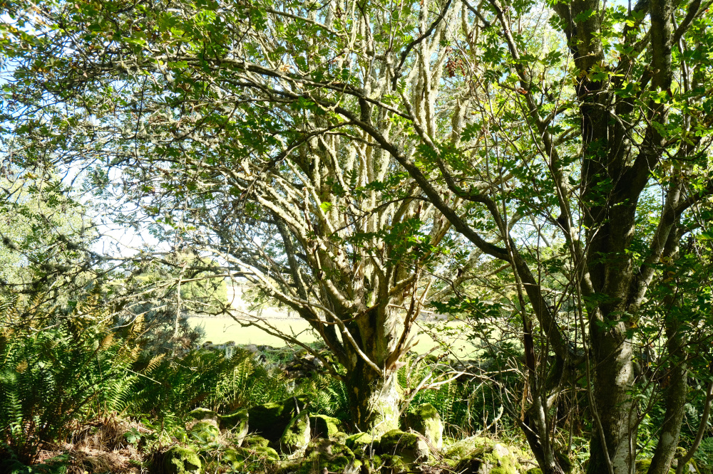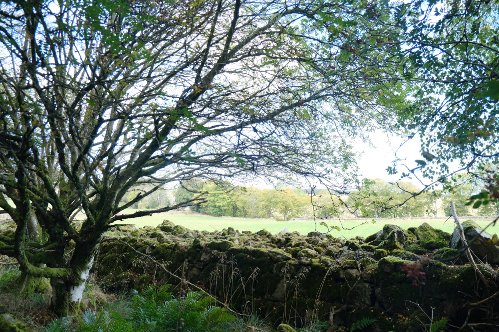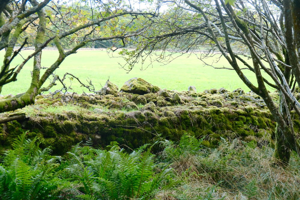 Boundaries are marked by a wide dry stone wall on one and fencing around the rest of the woodland.