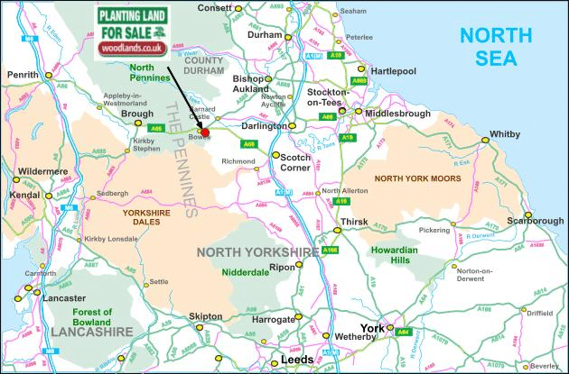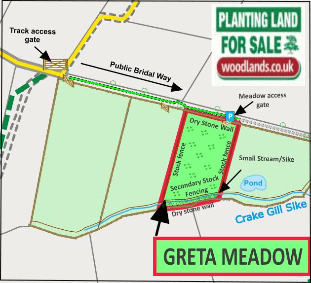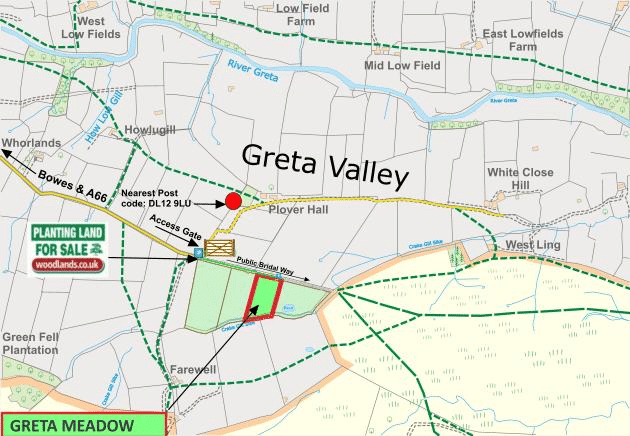 Directions: To locate the meadow, when heading East or West along the A66 follow the exit signs for the A67 signposted Barnard Castle. Then turn right following the signs for A67 Bowes, and take a left off the A67 heading into Bowes village. At the next roundabout, head straight on towards Gilmonby and follow the single track road until you pass a large farm yard on your left. Keep driving past the farm until you meet a fork in the road, at which you should follow the left fork. This will take you over an old narrow stone bridge, keep driving up the incline until you arrive at a very sharp left-hand bend with a metal gate immediately in front of you. You will also see the Woodlands.co.uk “FOR SALE” sign attached to the dry-stone wall on your right.