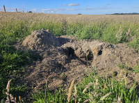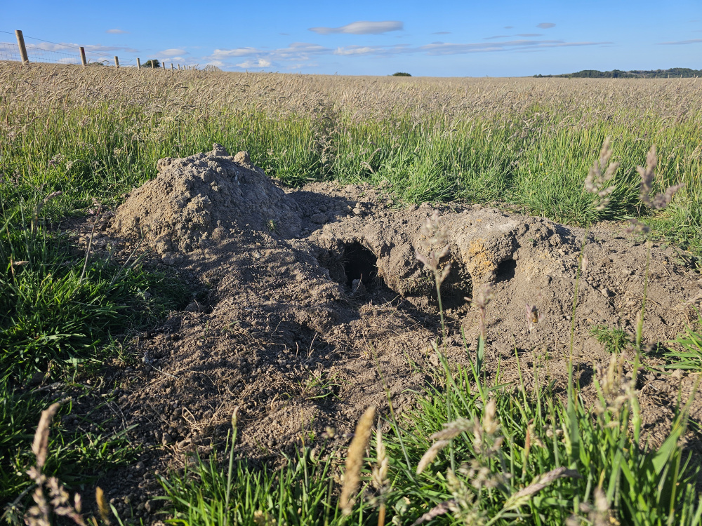 The meadow is home to active wildlife populations, with natural mounds and burrows indicating established rabbit and hare habitats