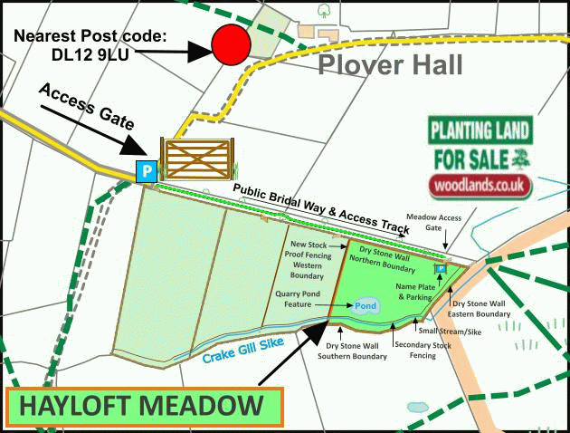 Hayloft Meadow is conveniently located just a short drive from the main A66 trunk road which bridges Yorkshire, Durham and The Lake District. Access is gained via a gated green lane from the public highway as shown on the wood map. A further wooden field gate near the end of the track (the fourth on your right-hand side) gains you access on to the meadow itself.