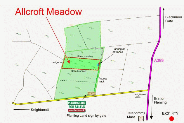 Access to the land is down a well-maintained stoned track suitable for year-round vehicular use. Exit from the A399 towards Knightacott, and you'll spot the entrance gate and Woodlands sign about 350 meters down the lane on the right. Park by the road, climb the gate carefully, and then follow a track for approximately 200 meters along the top of a large field to reach the meadow on your left hand side.