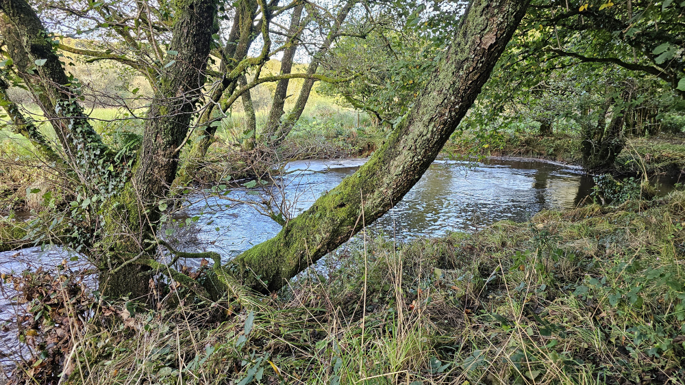A picturesque view of the rippling waters of the River Torridge, flowing gently along the northern banks of the meadow