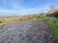 The meadow is accessed via a stoned track from an unnamed public highway, which terminates in a generous area of hardstanding at the entrance where vehicles can be parked. 180 degree panoramic views of a patchwork of pastureland and woodland can be enjoyed from this vantage point. The open land slopes gradually away from the hedgerow at the top of the field away from the entrance. A line of post and rail fencing demarcates the western boundary, which could be enhanced with the planting of a new hedgerow. The western boundary is formed by a fence which divides the meadow from neighbouring woodland to the east.