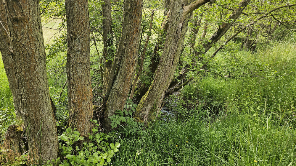A number of mixed broadleaf trees, bushes and mature hedgerows.