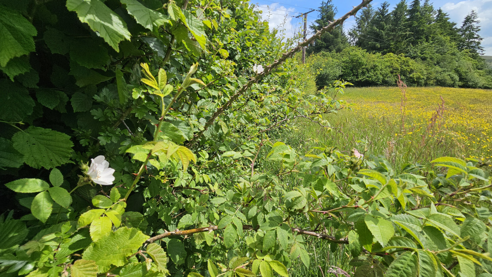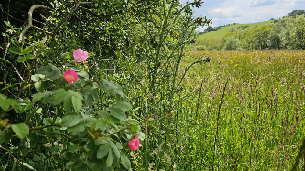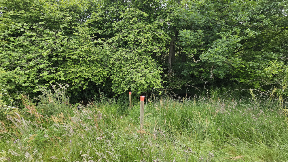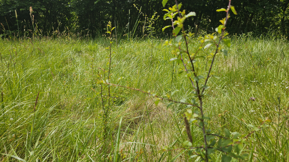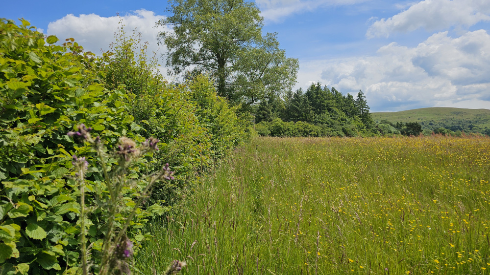 An opening in the hedgerow leading into section 2, a smaller more secluded section of meadow