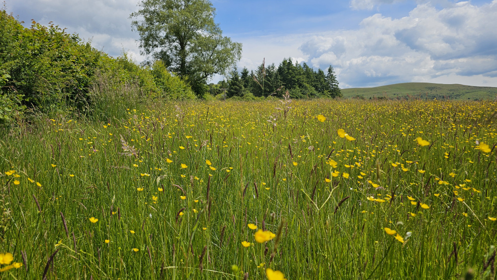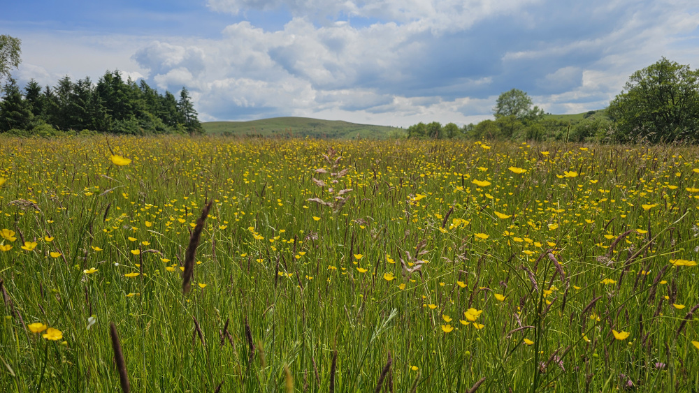 Wild flowers create a carpet of yellow across the wild meadow grass